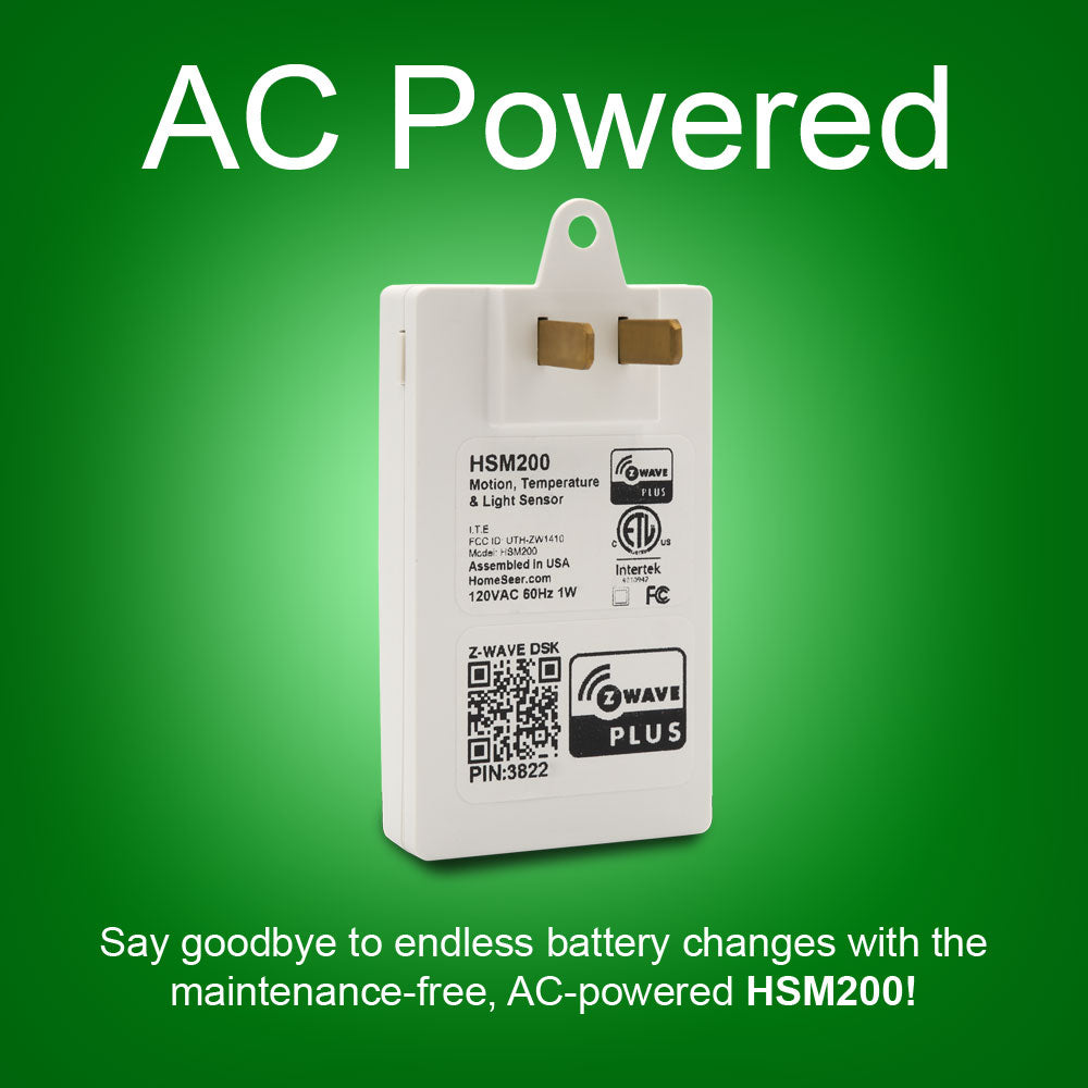 Since the HSM200 is line powered, there are no batteries to change and the unit automatically operates as a Z-Wave network repeater. Installation is fast and easy. Just plug into any available 120v outlet and tap the button on the side to join it to your Z-Wave network.