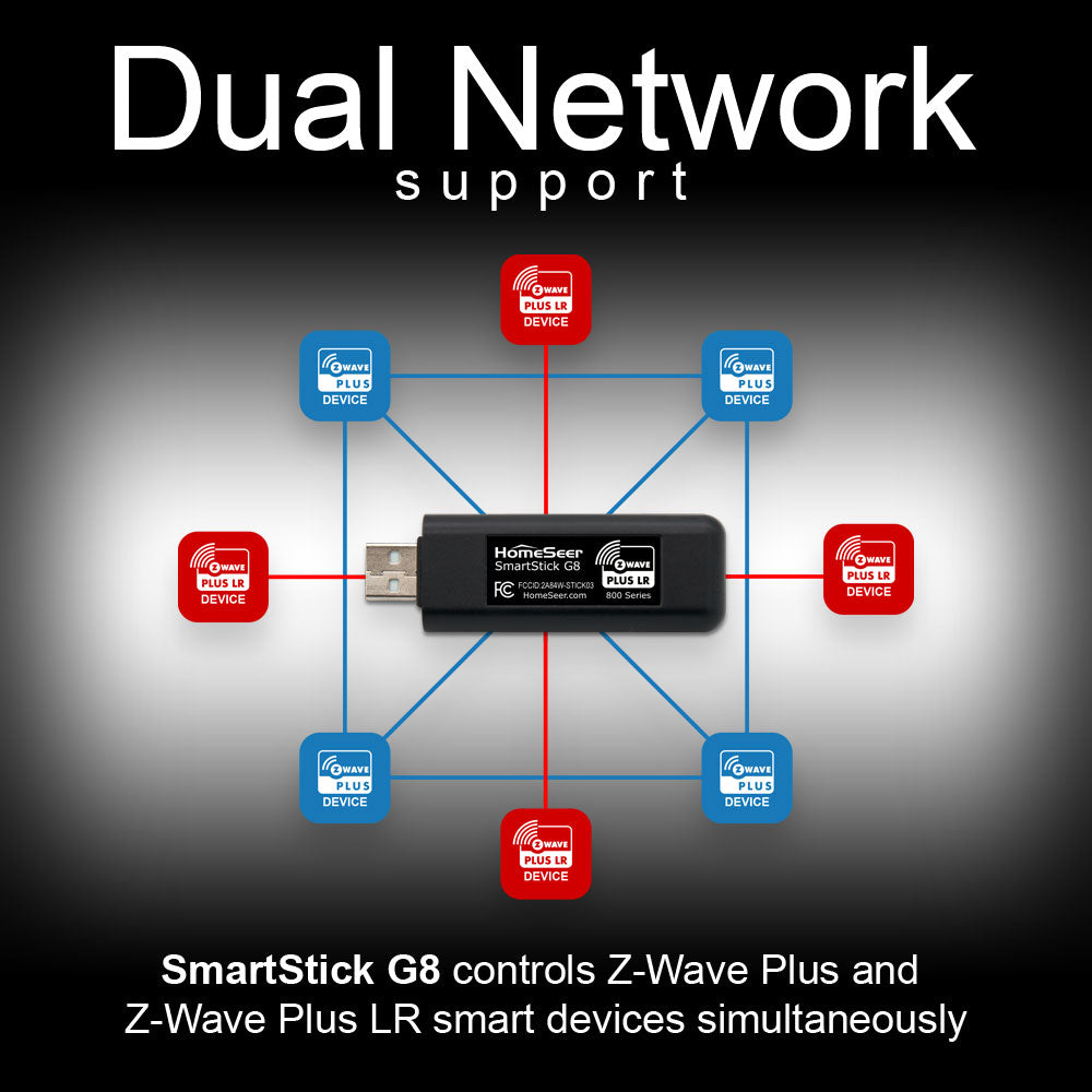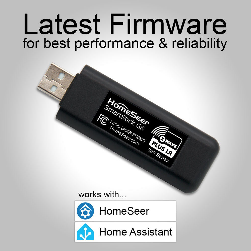 SmartStick G8 is a Z-Wave Plus V2 USB stick for use with HomeSeer, Home Assistant, and other Z-Wave compatible smart home software. SmartStick G8 offers extended wireless range and better security compared to previous SmartStick models. SmartStick G8 may be used with Z-NETs for a centrally managed, multi-network installation.